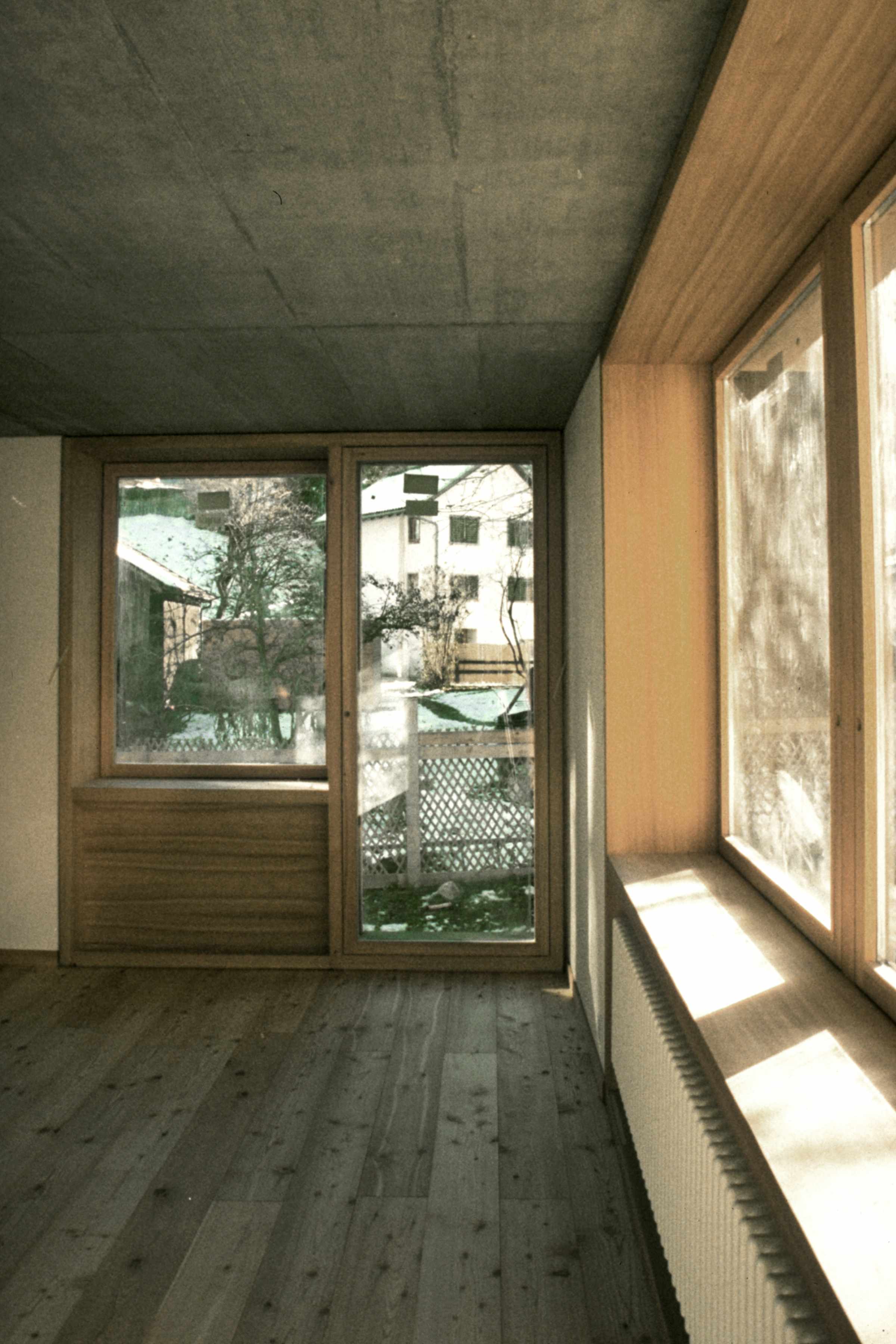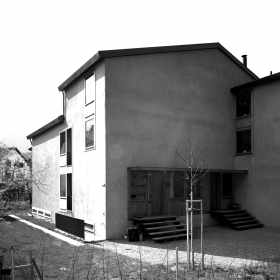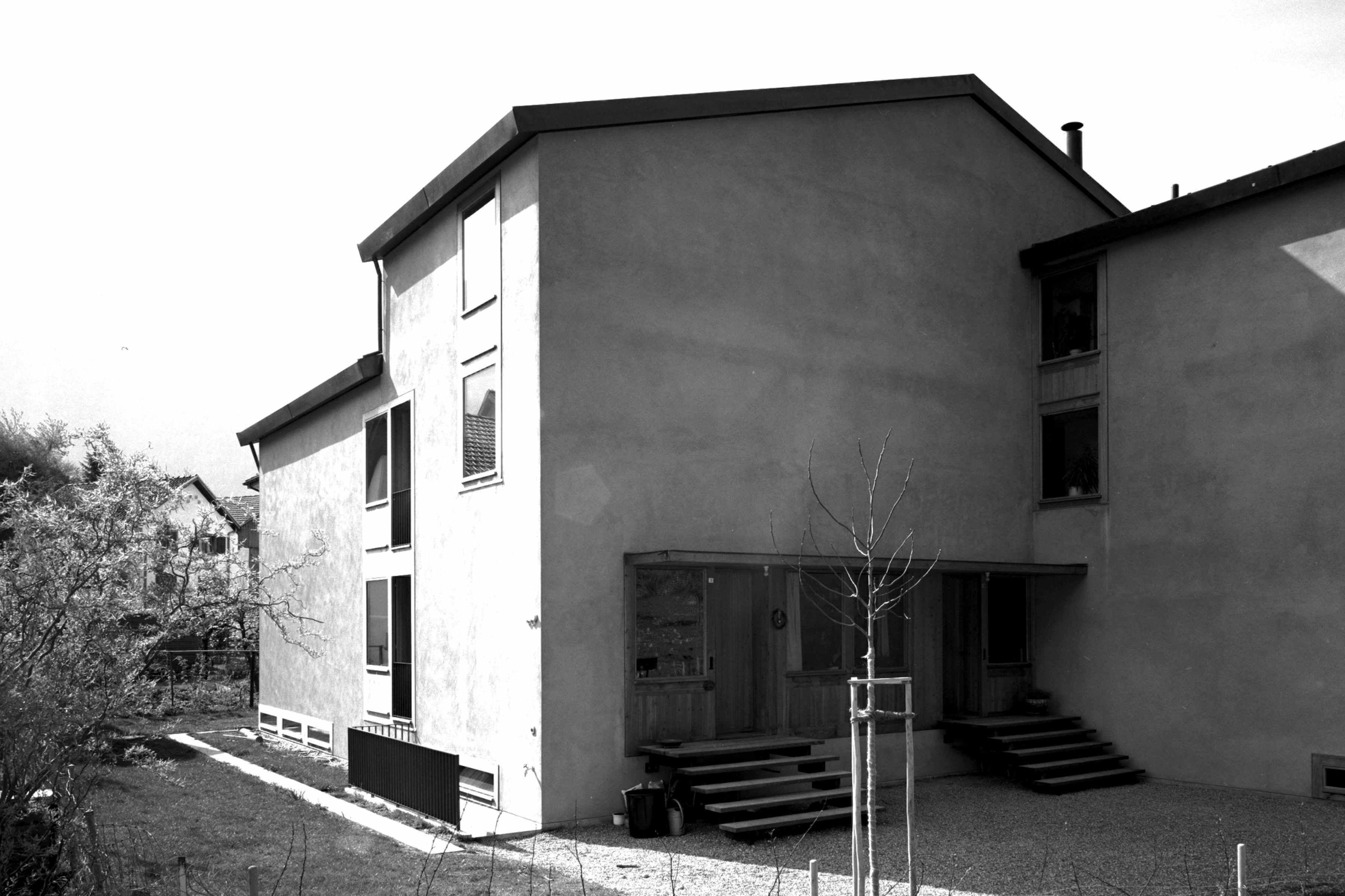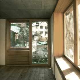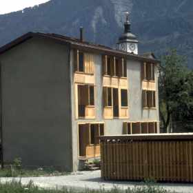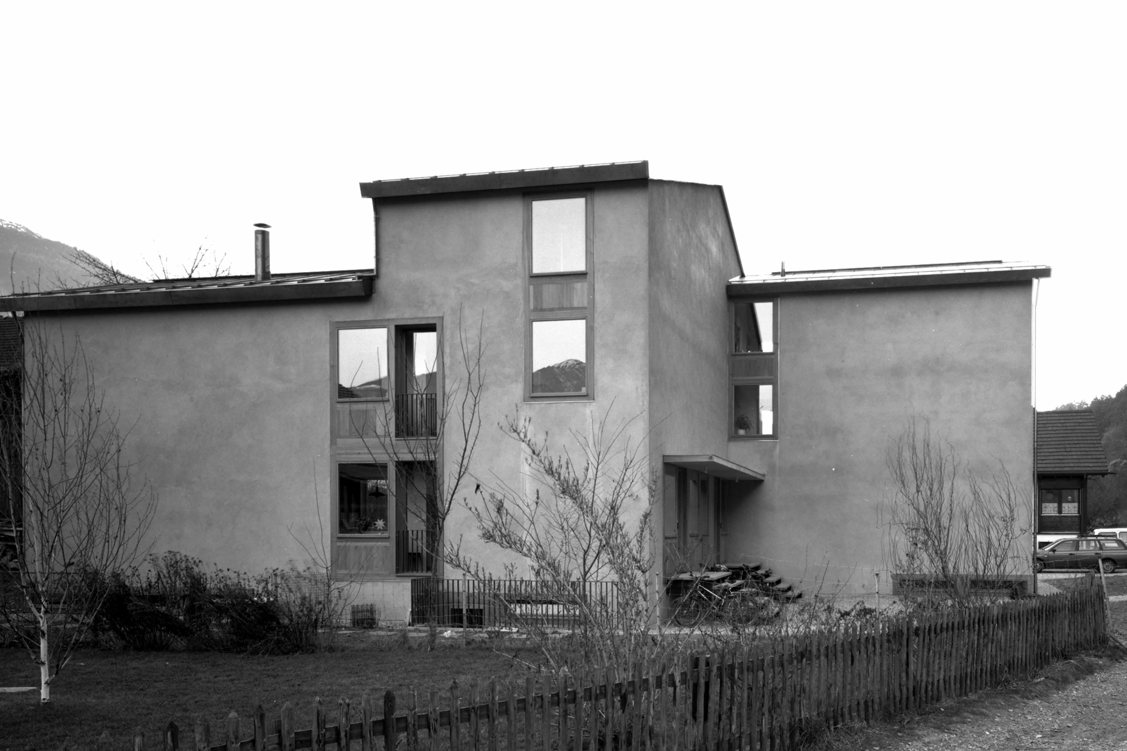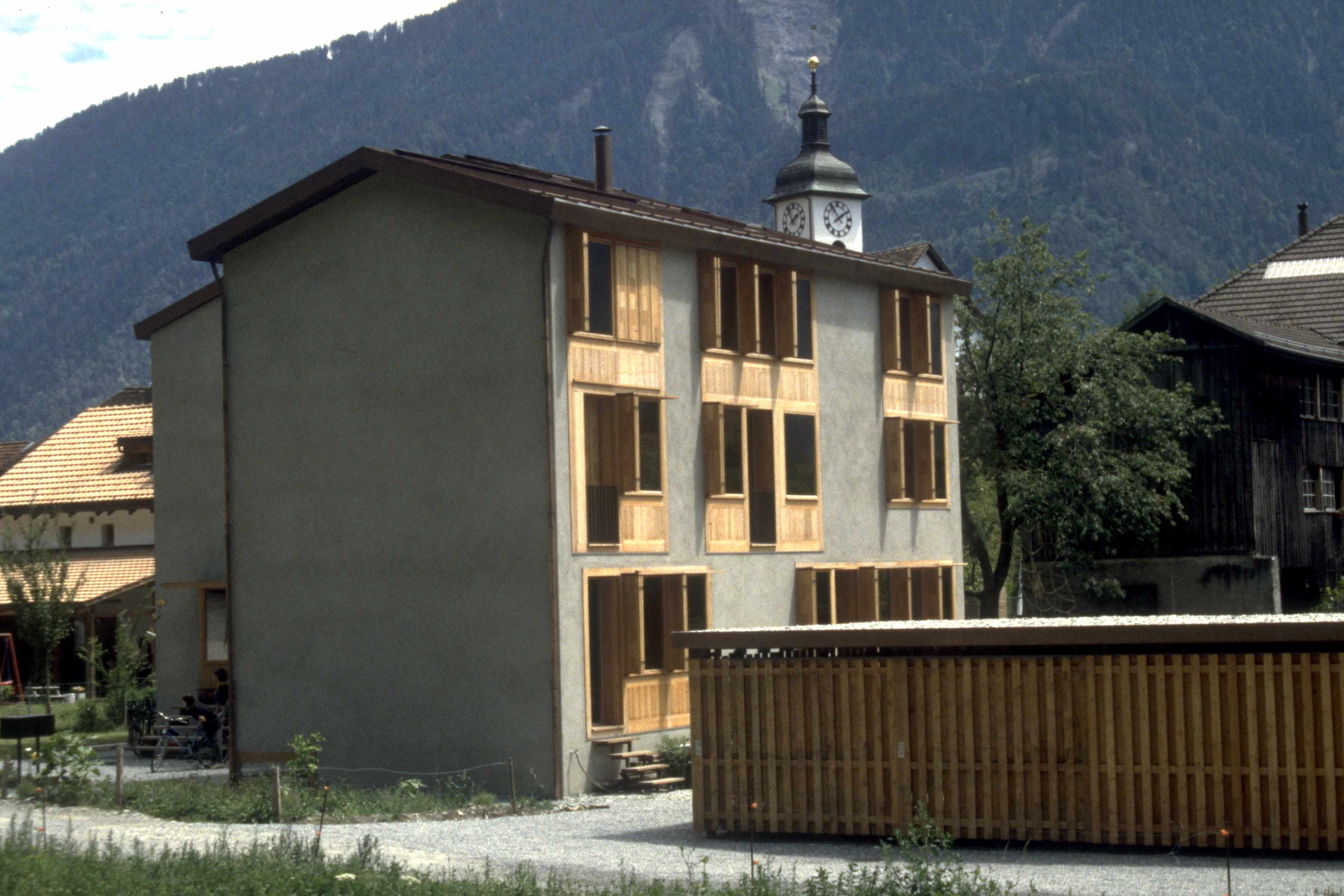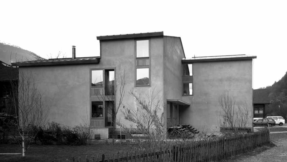 In dem historischen Dorfkern von Felsberg wurde ein grösseres Doppeleinfamilienhaus integriert. Eine asymmetrische, freie volumetrische Komposition nimmt einerseits auf die Bausubstanz der Umgebung, andererseits auf eine optimale Orientierung bezüglich Besonnung und Privatsphäre Rücksicht. Die Materialien Naturputz in Kombination mit Lärchenholz- innen und aussen- nimmt Bezug auf die ländliche Umgebung.