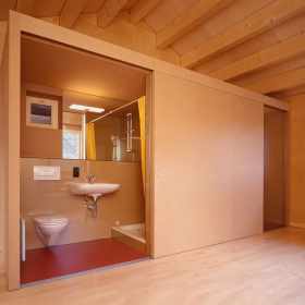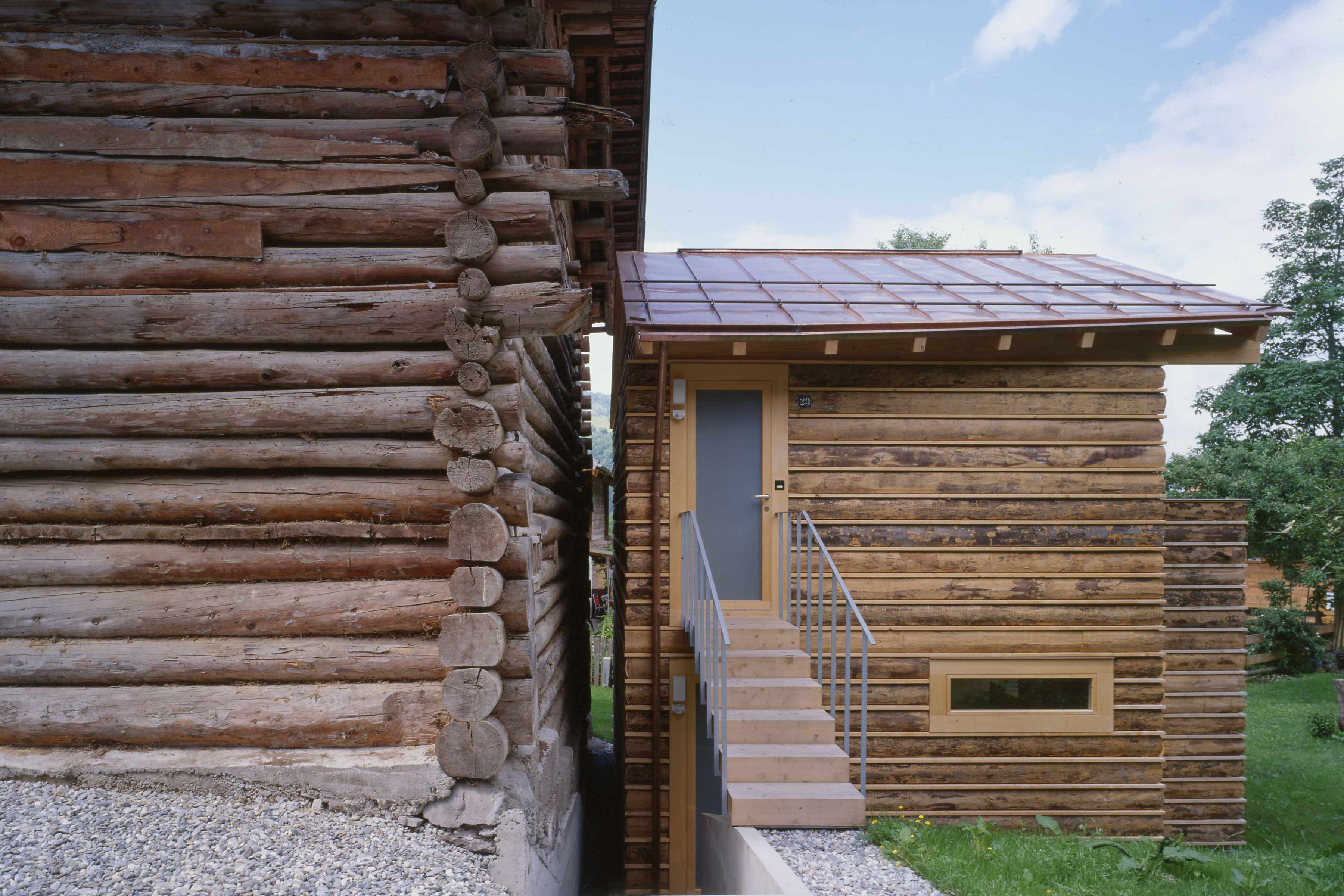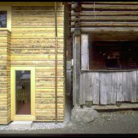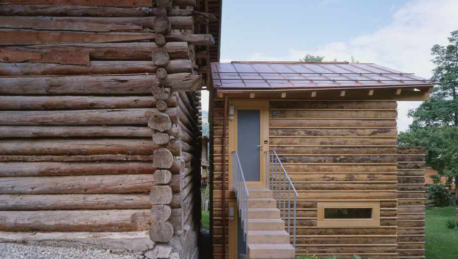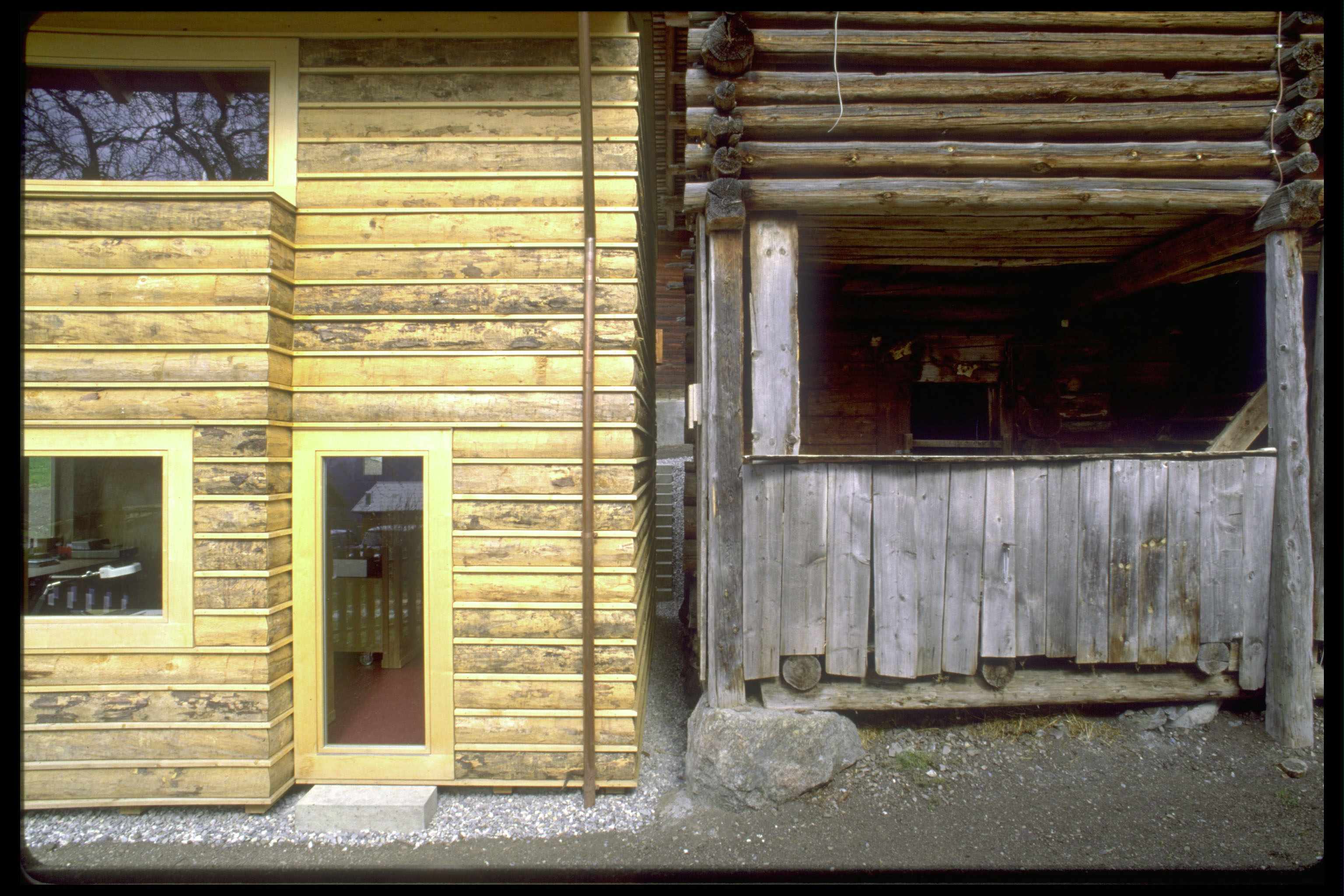 Wiederaufbau eines kleinen Atelier- und Wohnhauses im Hofstadtrecht in unmittelbarer Umgebung eines Rundholzstalles. Mit Rundholzabschnitten wurde eine einfache, hinterlüftete Fassade entwickelt, die das vertraute Bild der umgebenden Gebäude neu interpretiert.