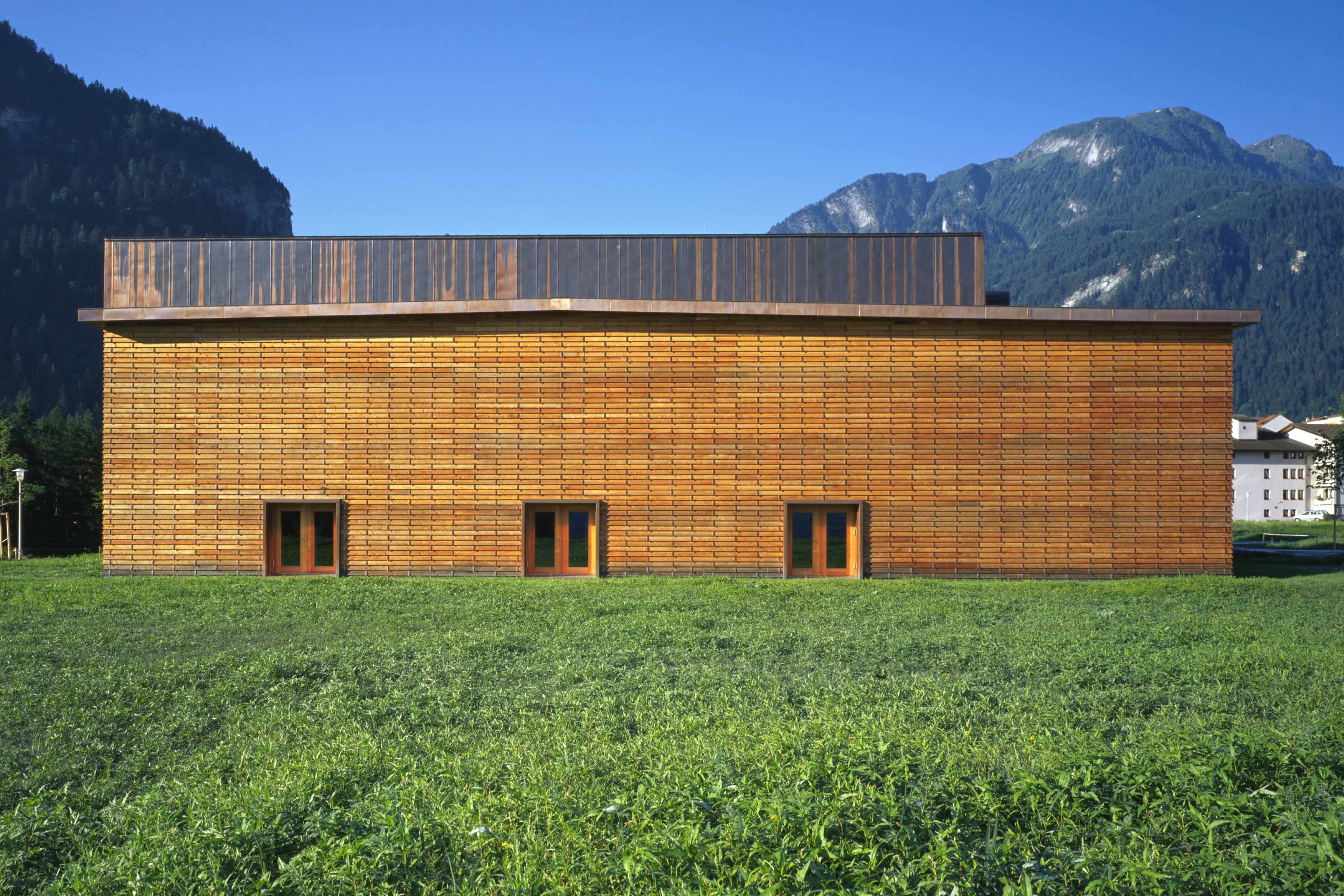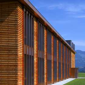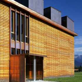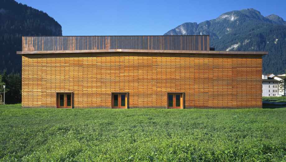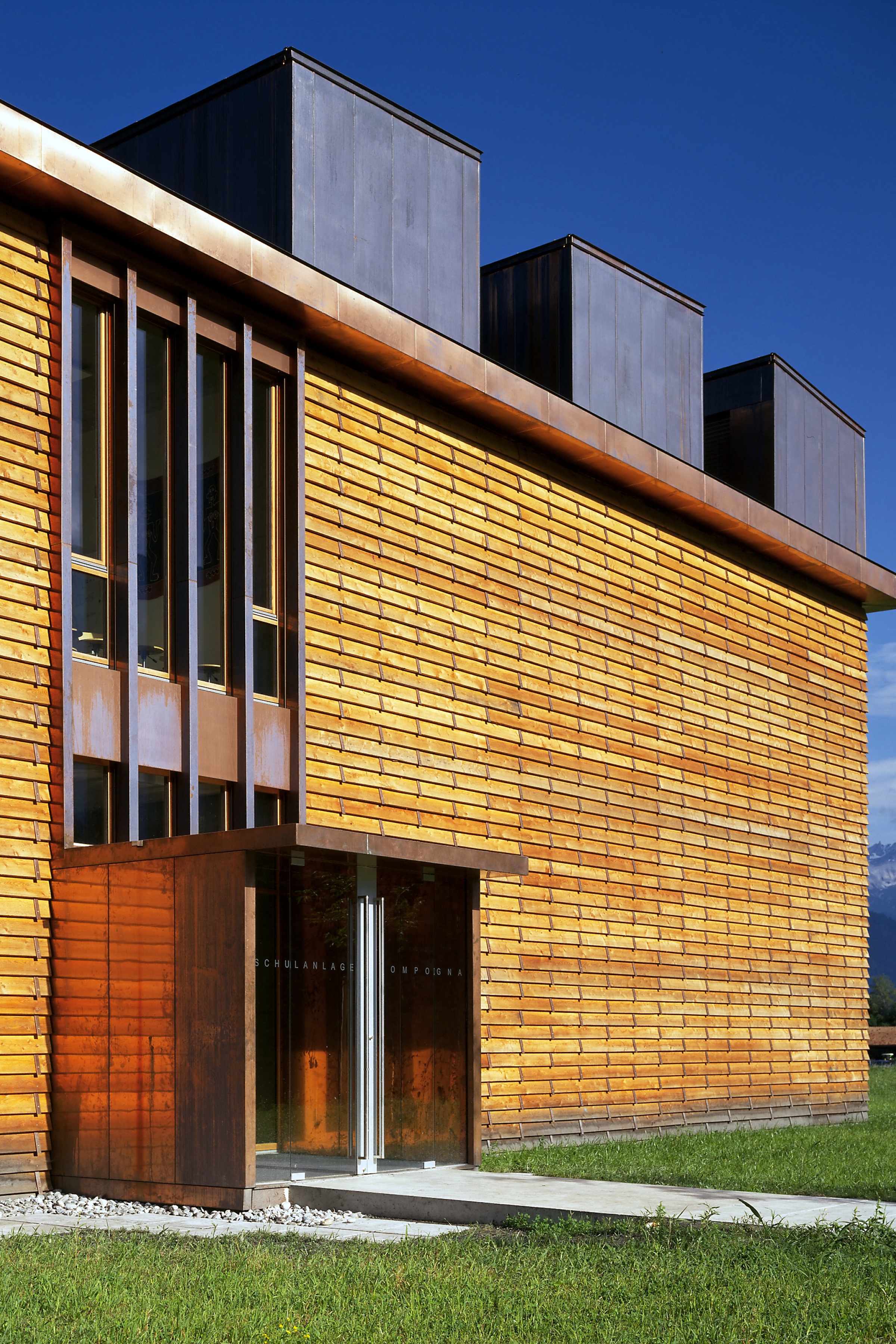 Die kompakt angelegte, werkstattartige Schulanlage ermöglicht mit innenliegenden, sowohl den Unterrichtsräumen wie auch dem Korridor zugeordneten Vorbereitungs- und Gruppenräumen eine flexible, werkstattartige Unterrichtsgestaltung im „Cluster-Prinzip“. Innovative Interpretation einer hinterlüfteten Stülpschalung unter Nutzung einheimischer Ressourcen.