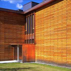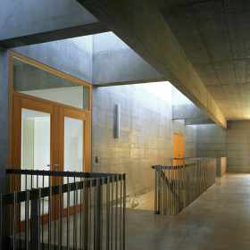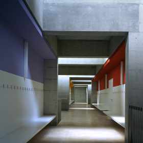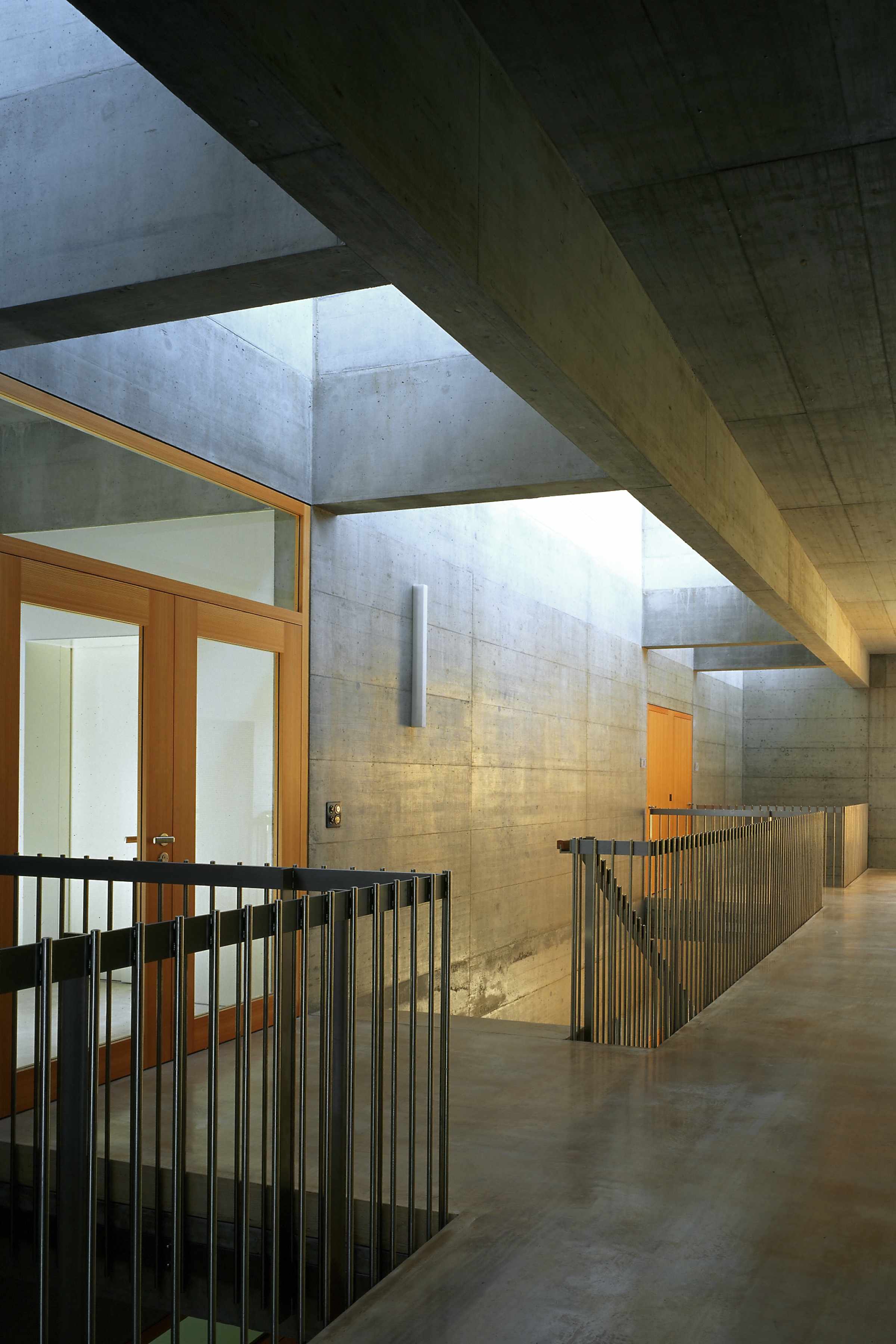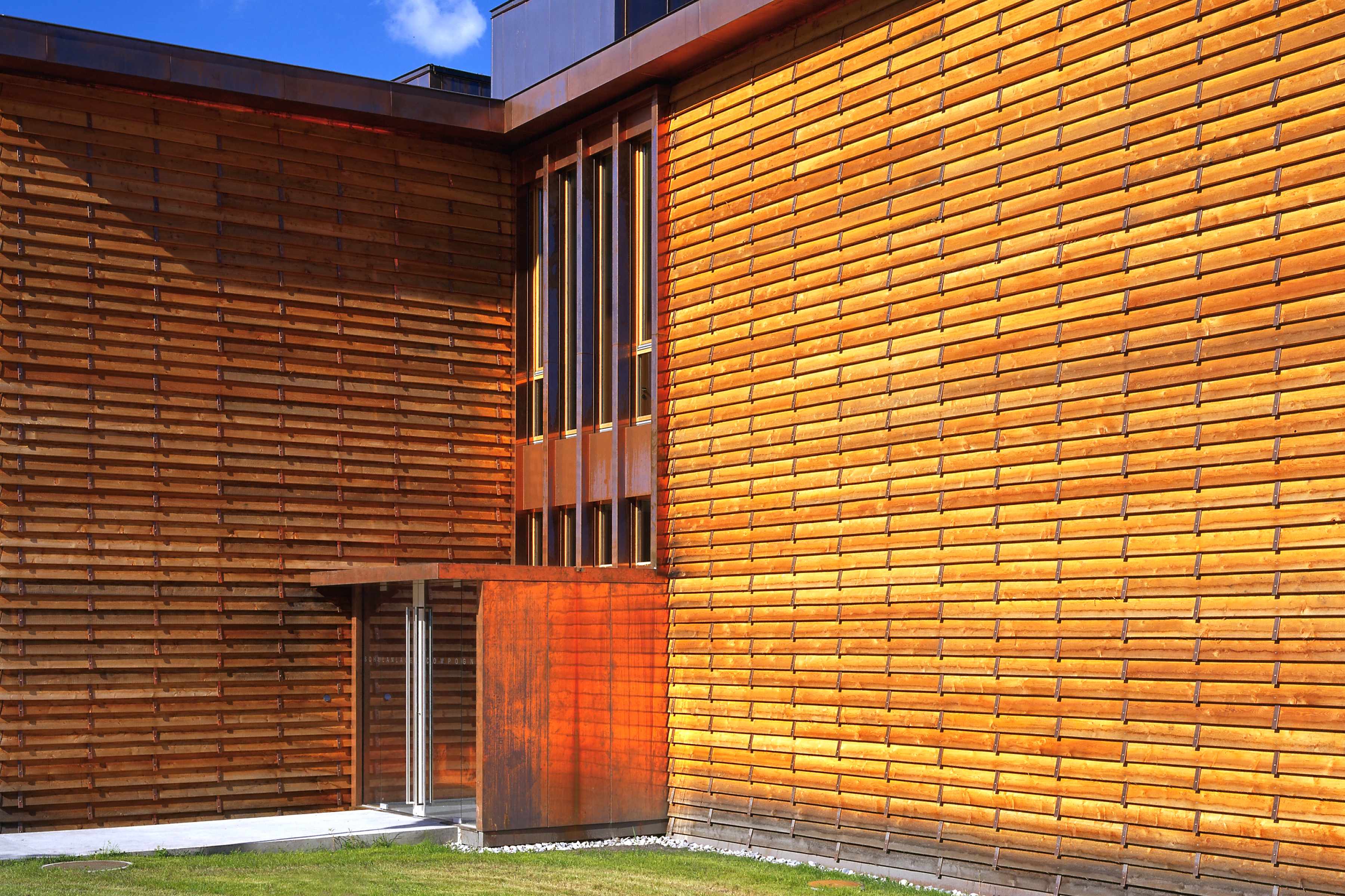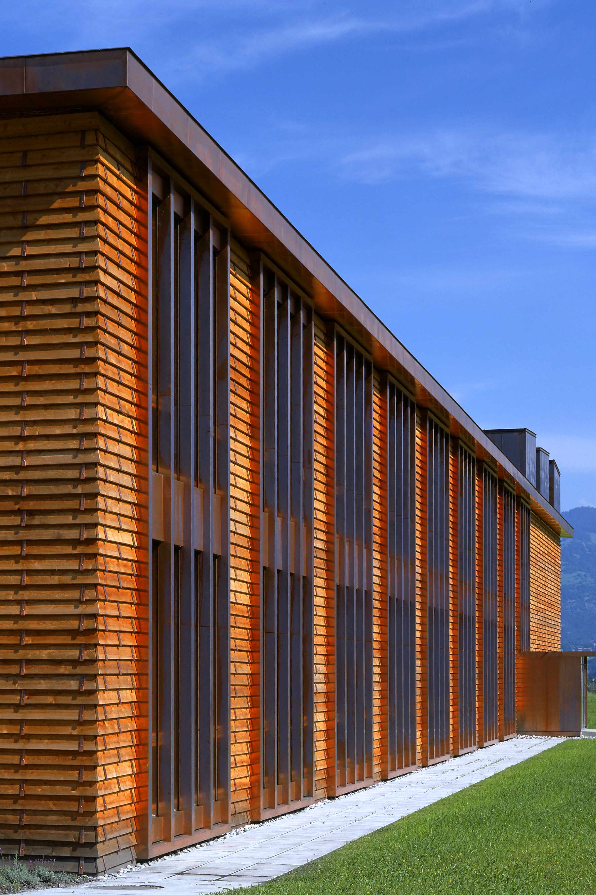 Die kompakt angelegte, werkstattartige Schulanlage ermöglicht mit innenliegenden, sowohl den Unterrichtsräumen wie auch dem Korridor zugeordneten Vorbereitungs- und Gruppenräumen eine flexible, werkstattartige Unterrichtsgestaltung im „Cluster-Prinzip“. Innovative Interpretation einer hinterlüfteten Stülpschalung unter Nutzung einheimischer Ressourcen.