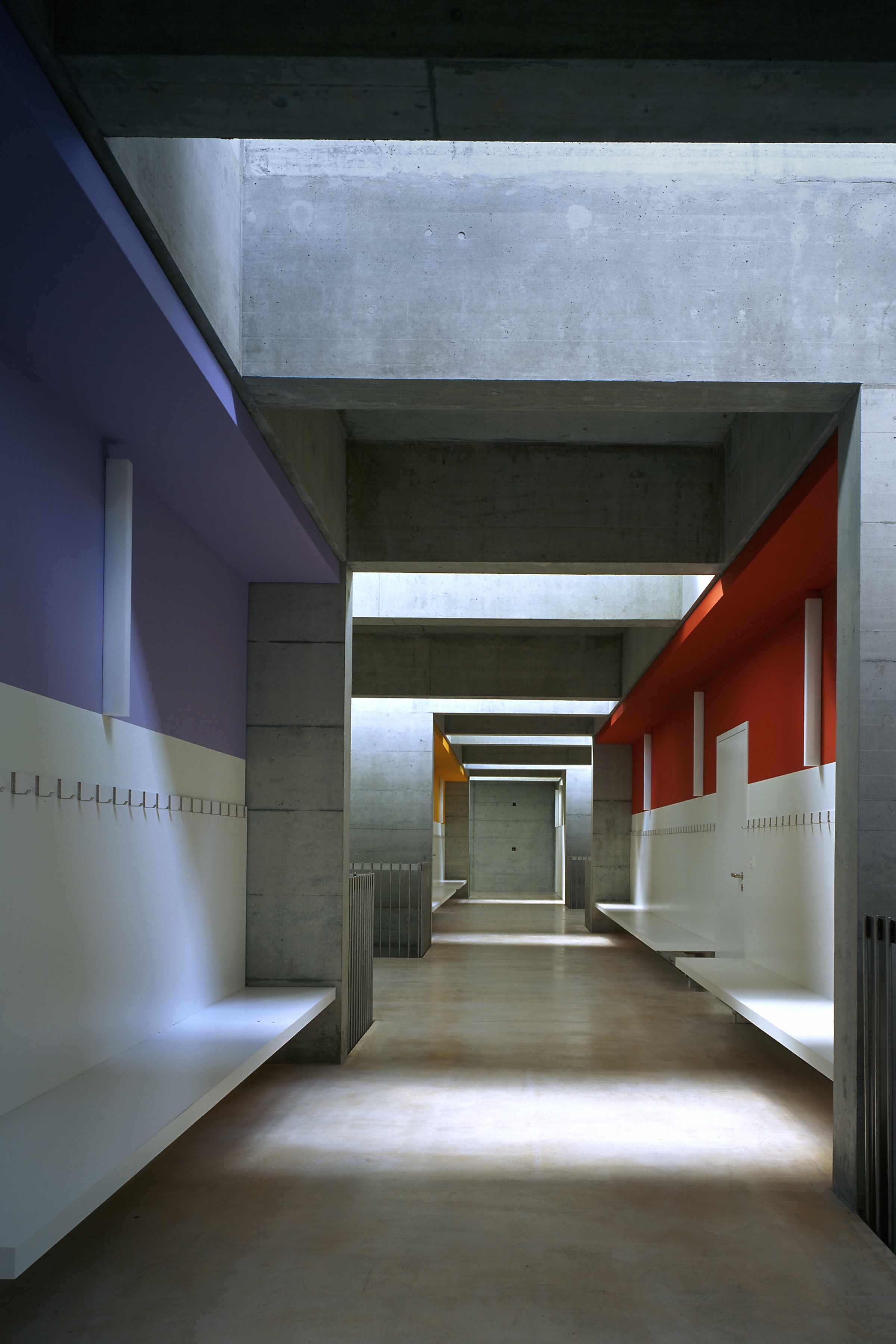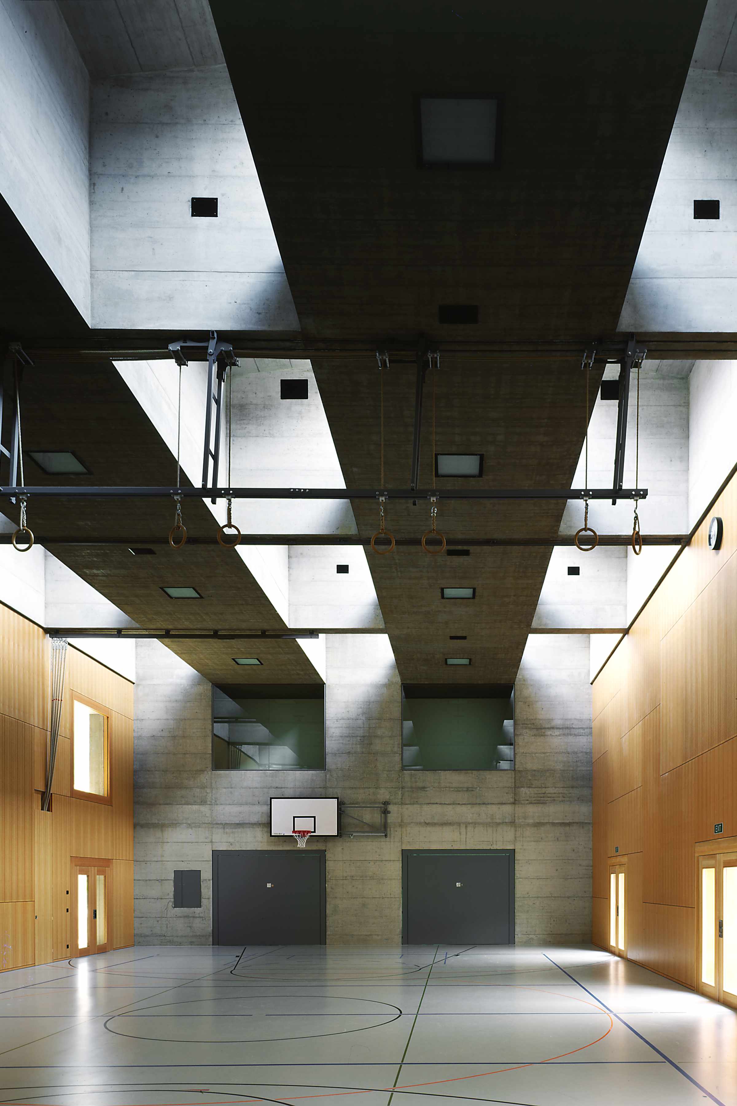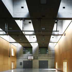 Im Gegenzug besteht das Anlagekonzept aus einer kompakt angelegten Baustruktur, in der in zwei Richtungen einfache Erweiterungsmöglichkeiten vorgezeichnet sind: Die Tragstruktur der Turnhalle wird mittels Trägern, die gleichzeitig als Oblichtkörper ausgebildet sind, längs gespannt und kann linear nach Norden zur ursprünglich gewünschten Doppelsporthalle erweitert werden. Die Tragwerksidee ist der Rahmen zur Entwicklung einer zweibündig angelegten, zenital belichteten Raumstruktur für den Schultrakt, der linear nach Süden erweitert werden kann.