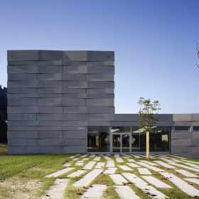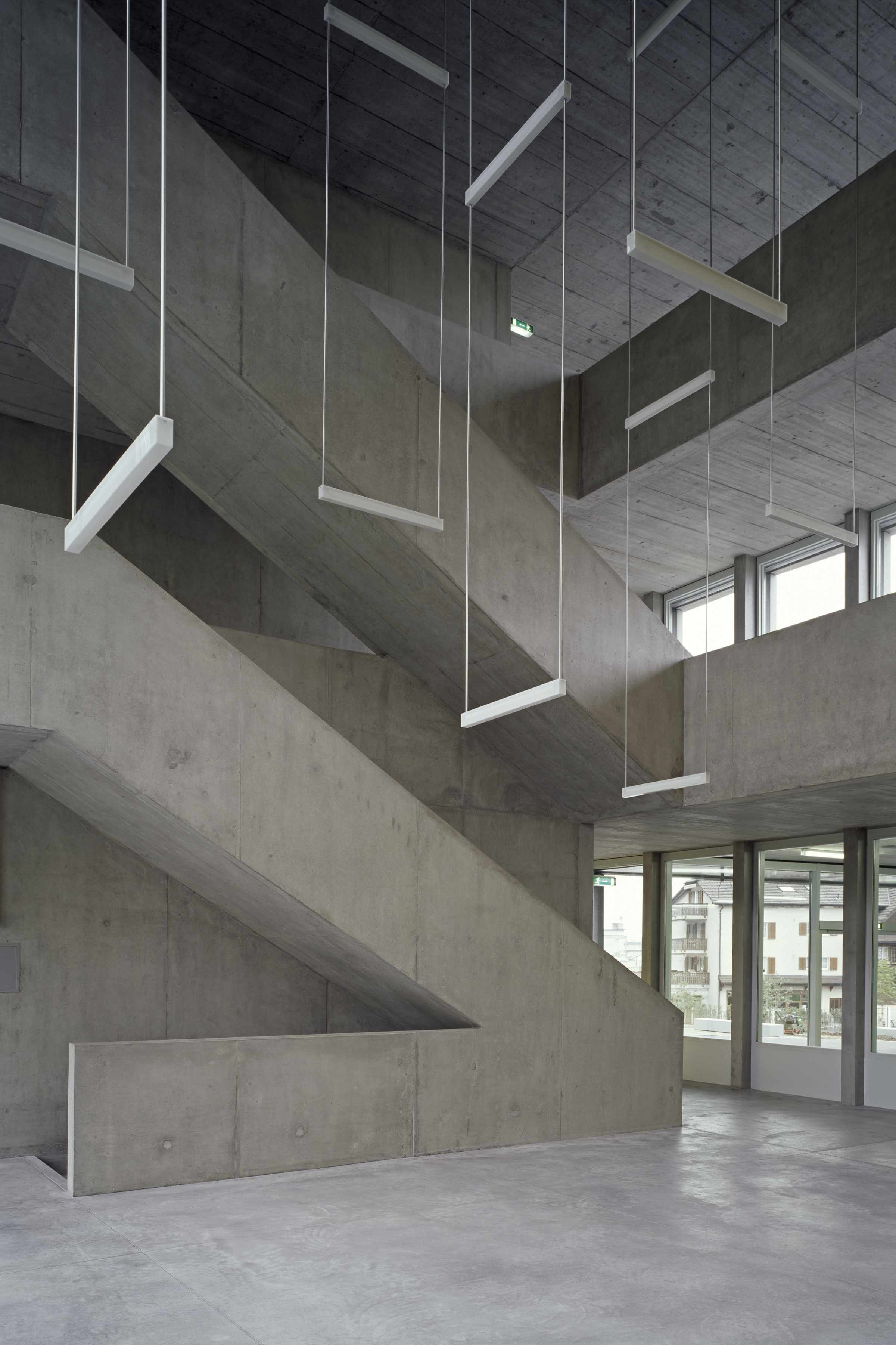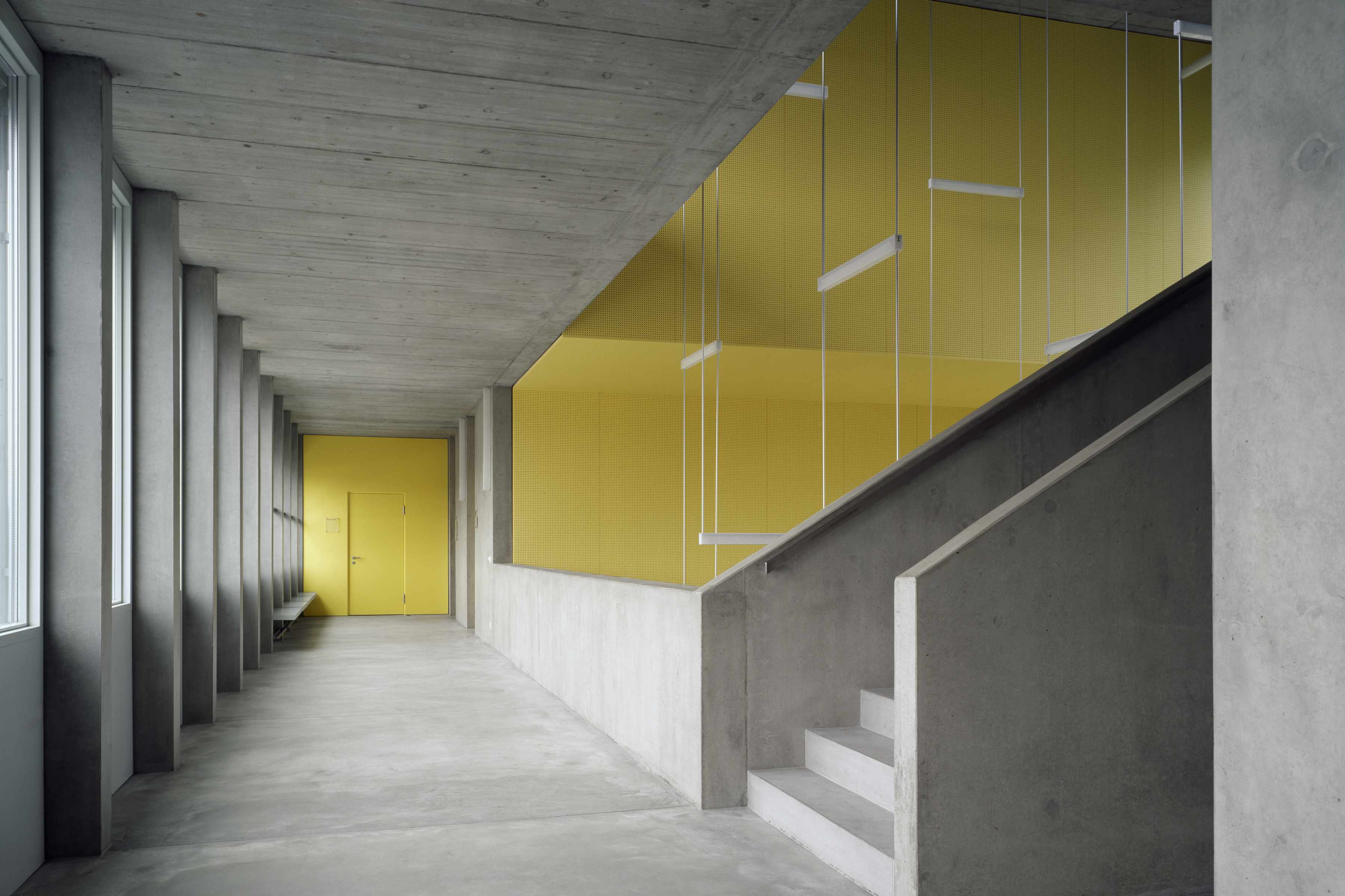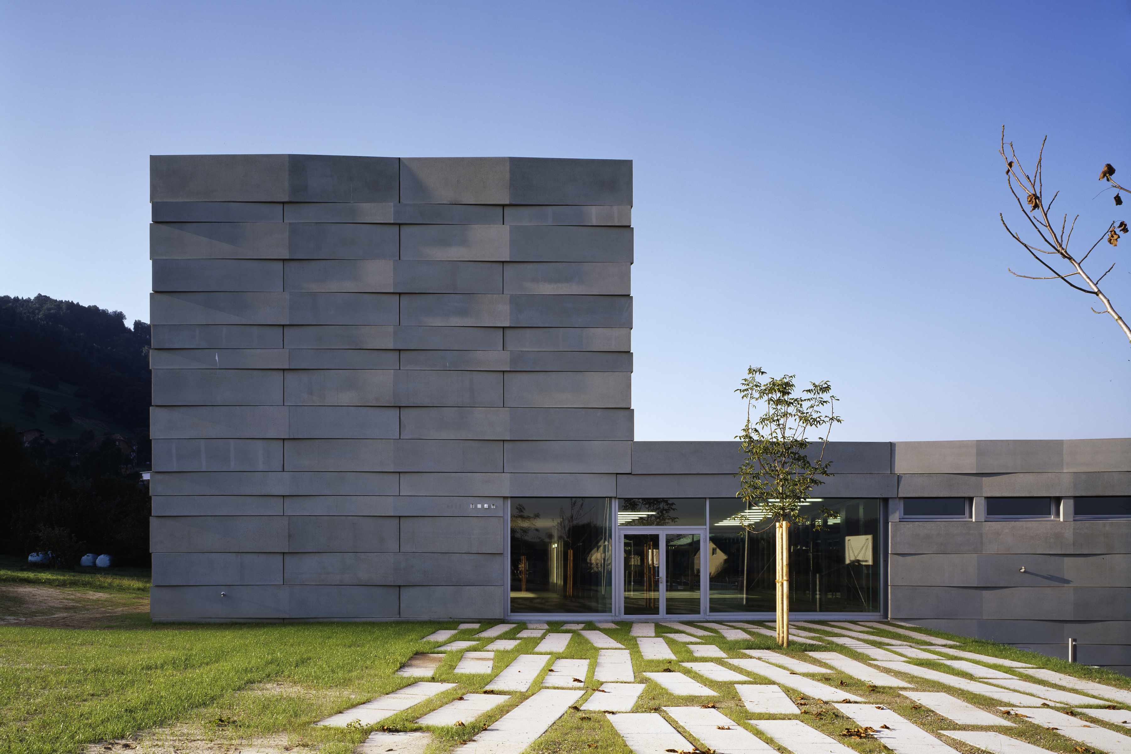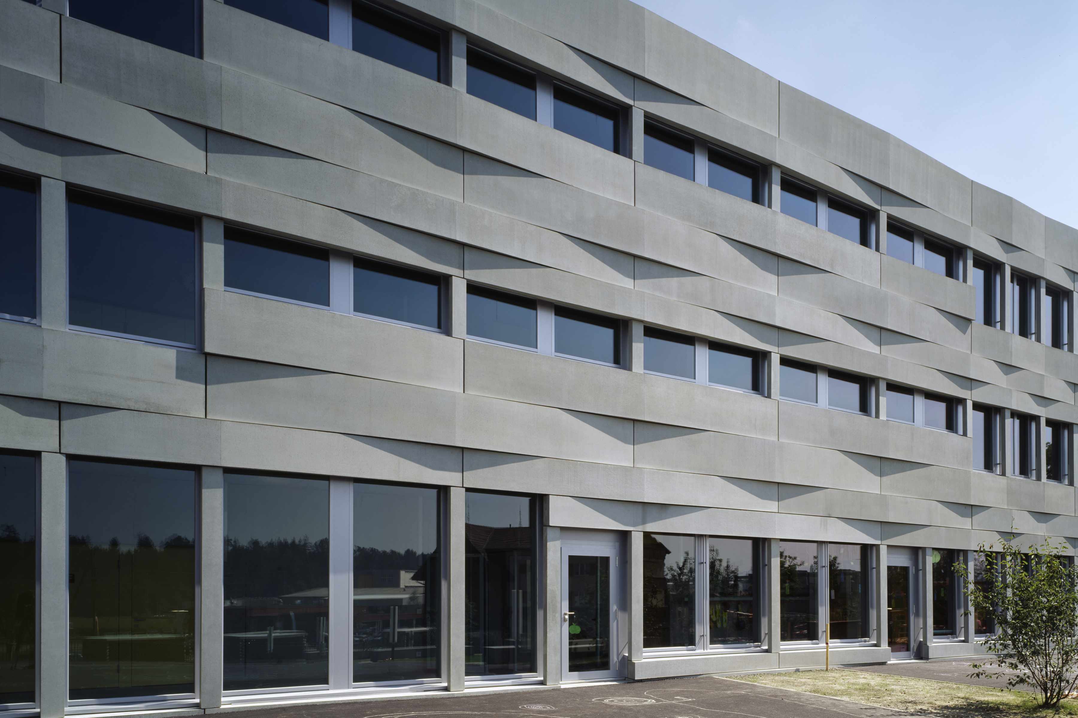 Das Volumen des neuen Schulhauses integriert sich harmonisch in das geneigte Gelände des Hanges und die im Landschaftsbild markanten Gewässer und Hecken. Der L-förmige Baukörper ist parallel zum natürlichen Geländeverlauf gesetzt und bildet zusammen mit der Bepflanzung entlang des Baches und des neuen Veloweges den klar geformten Pausenplatz ein neues Quartierzentrum. Der Verlauf des Veloweges wird entlang des Schulhauses geführt und trennt konsequent Velos und Fussgänger vom motorisierten Verkehr.